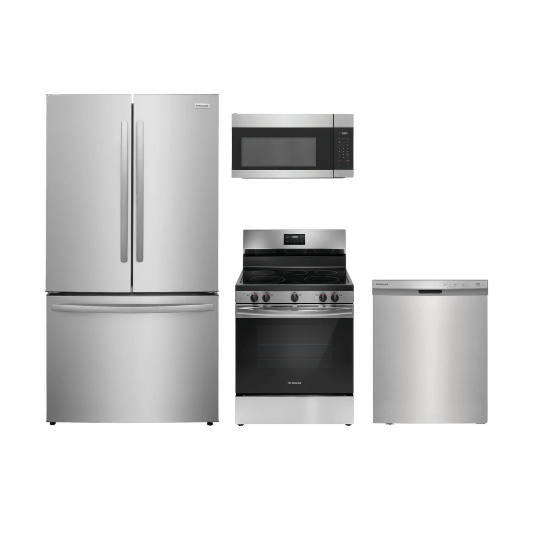 Frigidaire® 4 Piece Stainless Steel Kitchen Package with French door refrigerator, freestanding electric range, built in dishwasher and over the range microwave.Read More