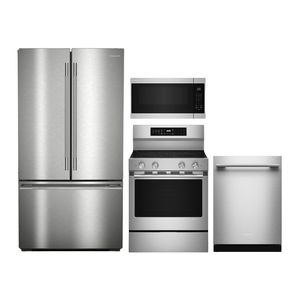 Upgrade your kitchen with the KitchenAid® PrintShield™ Stainless Suite, featuring a 36" Counter-Depth French Door Refrigerator, 30" Freestanding Electric Range, 24" Top-Control Dishwasher with Third-Level Jet Rack, and a 1.9 cu ft Over-the-Range Microwave — all designed for a seamless, professional look and powerful everyday performance.Read More