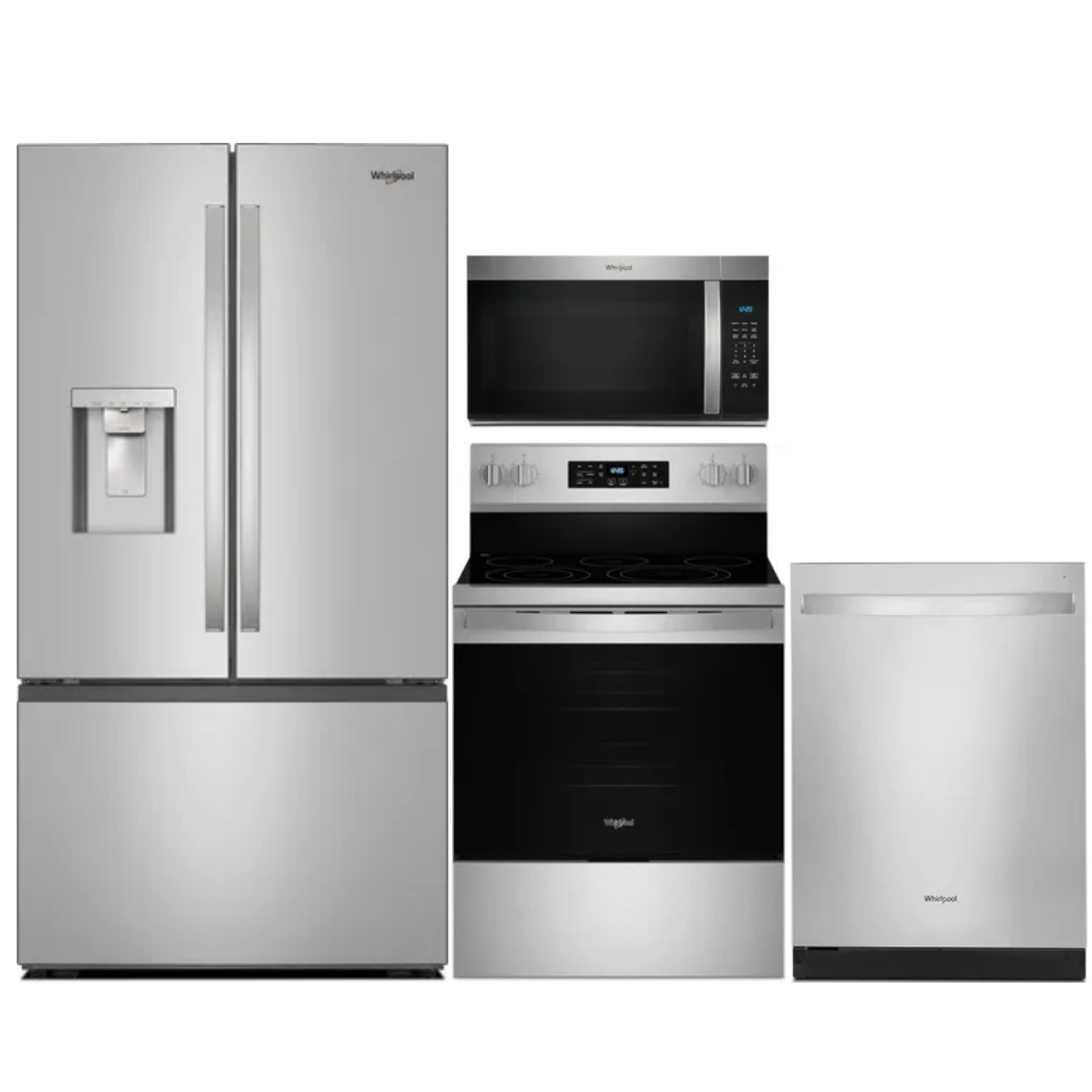 Whirlpool® 4 Piece Stainless Steel Kitchen Package with French door refrigerator, free standing electric range, built in dishwasher, and over the range microwave.Read More